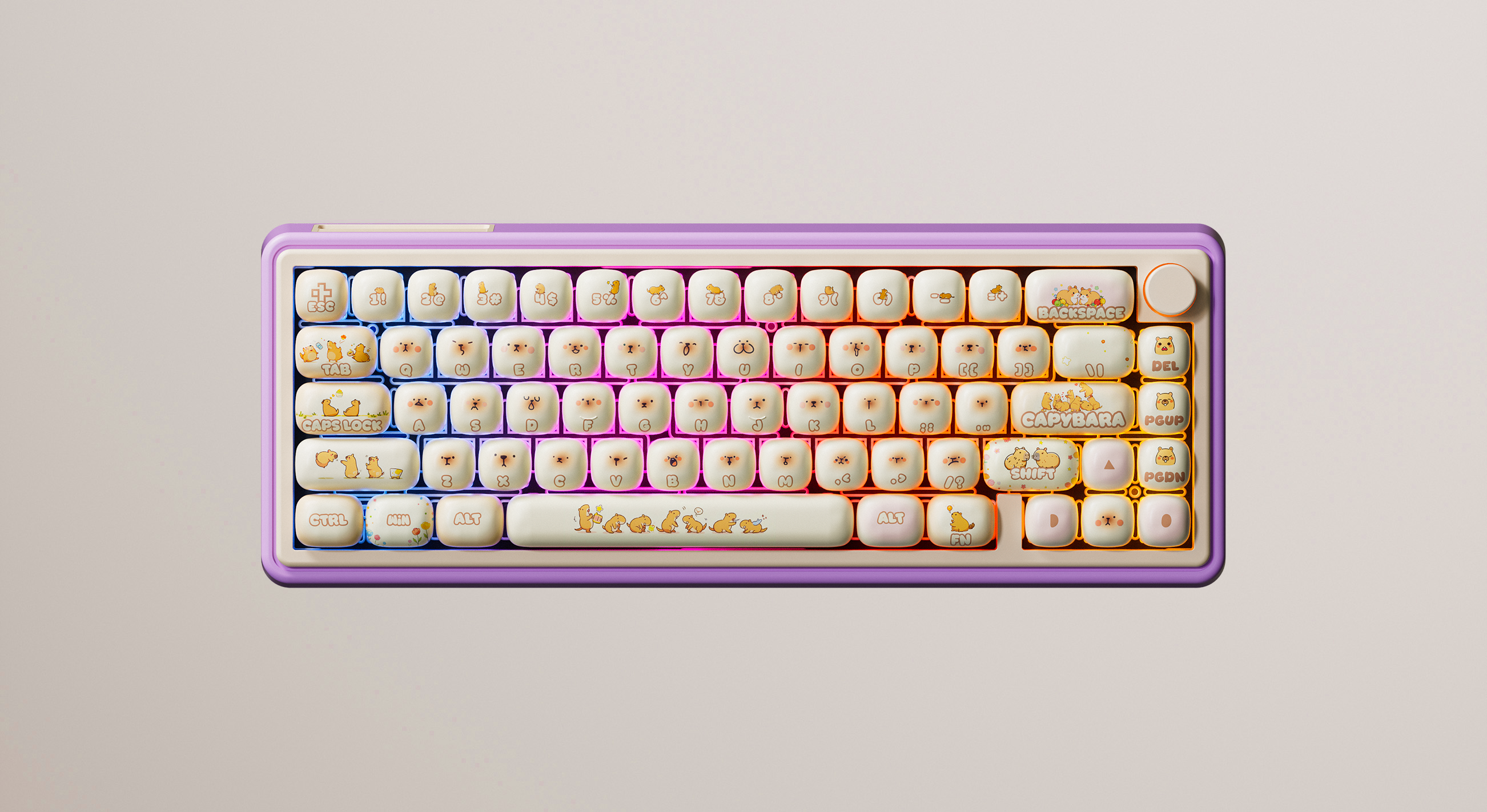 Ilustrațiile cu tematică capybara și keycaps-urile în tonuri pastel oferă un aer ludic, fără să sacrifice coerența sau echilibrul vizual. Este o opțiune ideală pentru cei care își doresc performanță, confort și un design memorabil, menținând totodată standarde înalte de construcție.